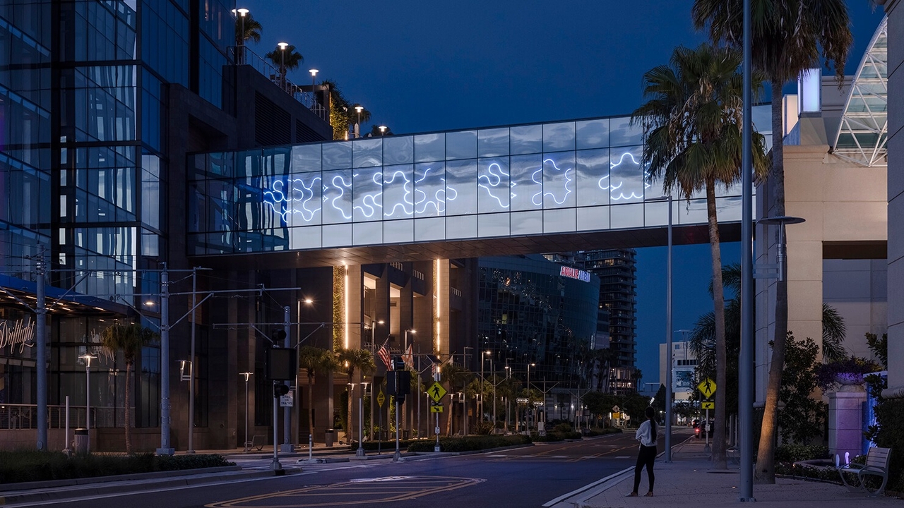 The playful canvas spans the length of the 200ft skybridge and is enlivened by real-time interactions. As a result, this artistic bridge offers a modern nod to Tampa’s unique ecosystem and historic port.