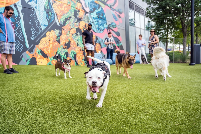 Featuring artificial turf, a pet water fountain, and with shaded areas close-by, this pocket park is a great way to give your four-legged friend some time in the sun.