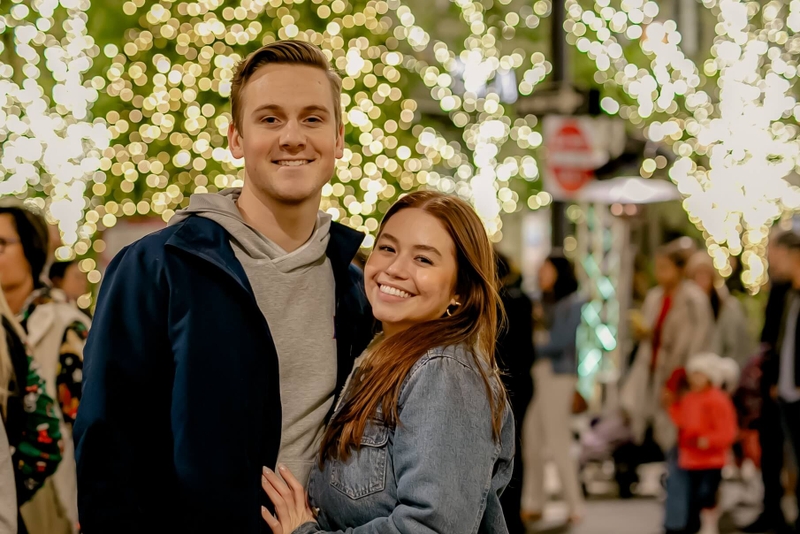 Stroll under glowing lights and falling snow with live music all around.